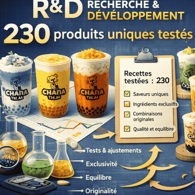 Plus de 230 recettes ont été étudiées, testées et affinées, afin de sélectionner uniquement celles qui répondent à nos standards de qualité, de goût et de cohérence. Ce travail minutieux permet de maîtriser chaque détail : choix des thés, qualité des ingrédients, équilibre des saveurs, textures et visuels.